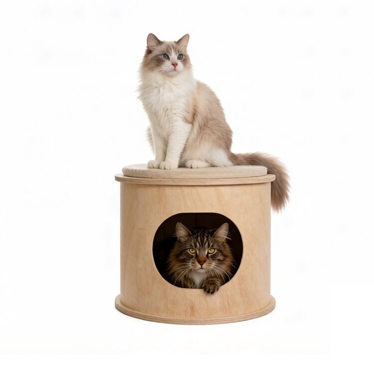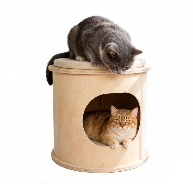 This multifunctional wooden pet house seamlessly combines a cozy feline sanctuary with a stylish piece of home furniture. We craft this unit from premium, durable plywood to serve as both a private cat den and a functional side table or footstool. Its minimalist cylindrical silhouette and natural wood grain finish complement any modern interior, making it a top choice for pet owners who value both design and utility.