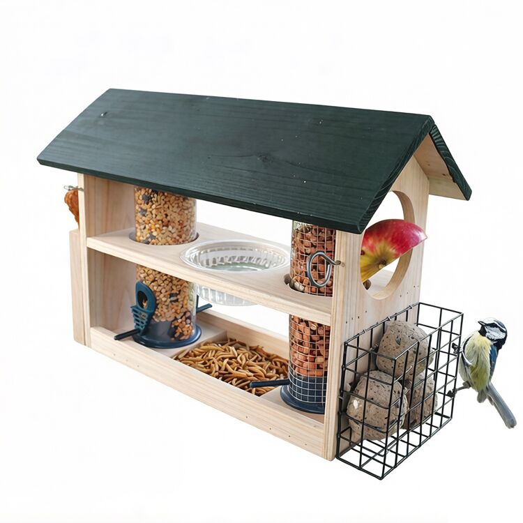 This solid wood bird feeder is crafted from durable cedar and designed for long-lasting outdoor use. It features a large 5-pound seed capacity and dual suet cages, making it ideal for attracting a variety of wild birds like woodpeckers and cardinals. With its weatherproof finish and easy-cleaning design, this feeder is a practical addition to any garden. We offer competitive factory prices and support bulk orders for wholesale partners and businesses.