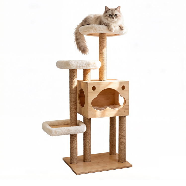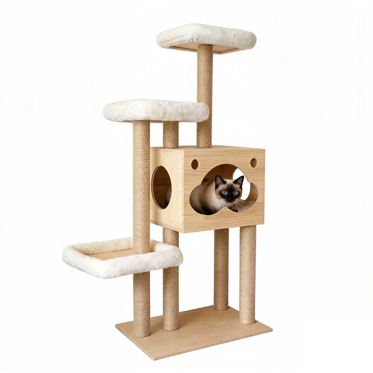 This robust Cat Play Tower is designed for households with large, active cats. Combining plush comfort with solid wood construction, it provides a dedicated space for climbing, playing, and resting. Its multi-level design maximizes vertical space, making it an ideal piece of modern cat furniture. We offer competitive factory prices and support OEM/ODM customization for bulk orders.