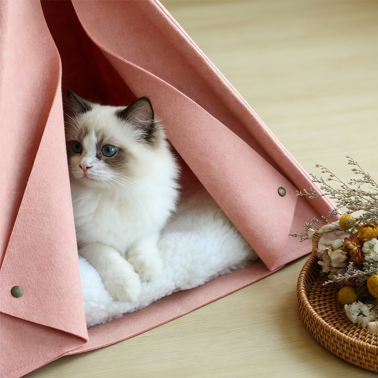 Provide your cat with a cozy felt teepee featuring a machine-washable cushion and sturdy pinewood frame. Perfect for naps, this portable tent offers privacy and comfort for small pets.