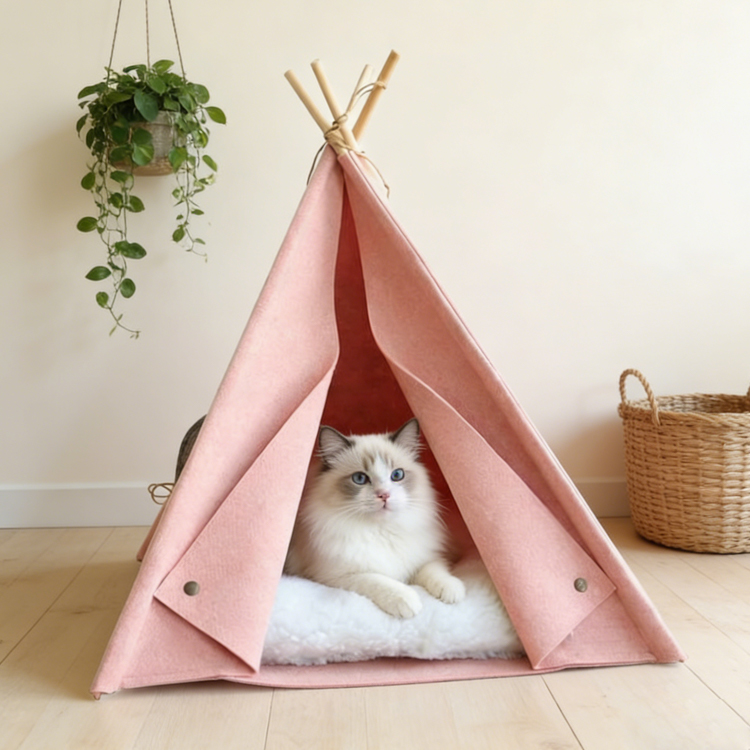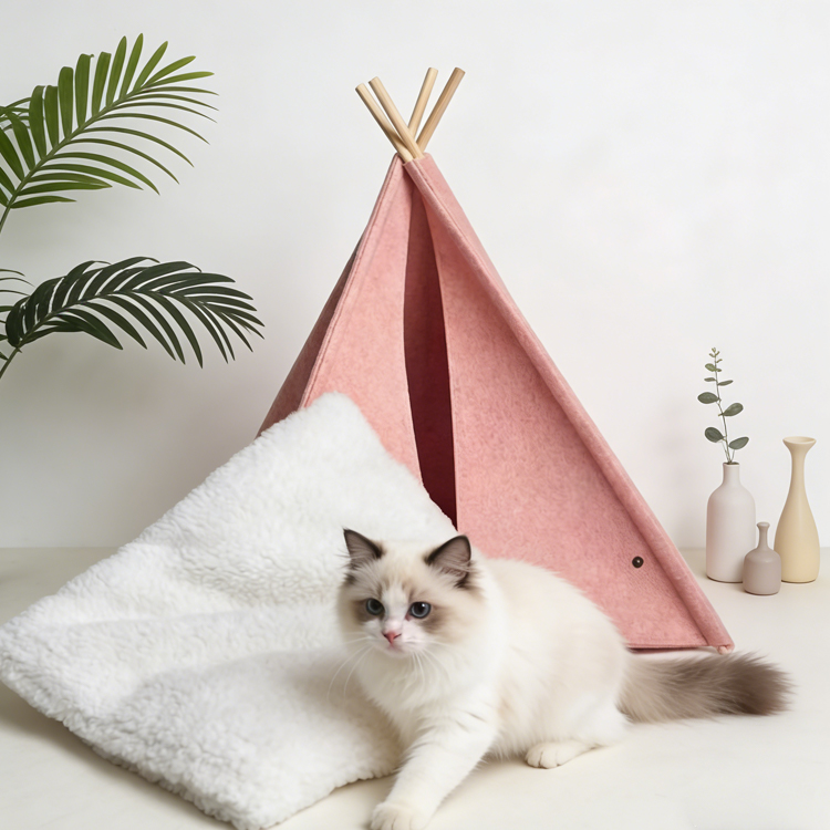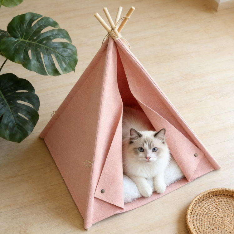 This Felt Cat Teepee provides a cozy retreat for small pets. Designed with a three-wall structure, it creates a secure sanctuary for cats and small dogs. The teepee combines thick felt fabric with sturdy pinewood poles for lasting stability. Ideal for wholesale and bulk orders, we offer competitive factory pricing and OEM/ODM customization services.