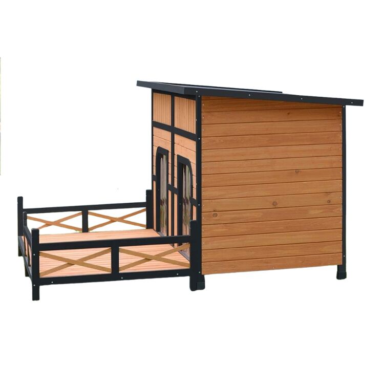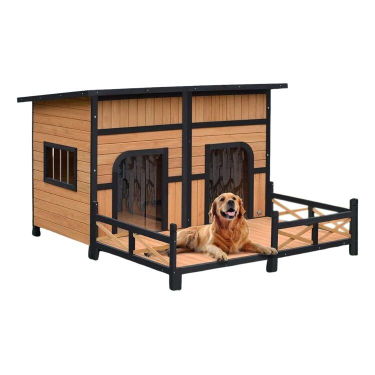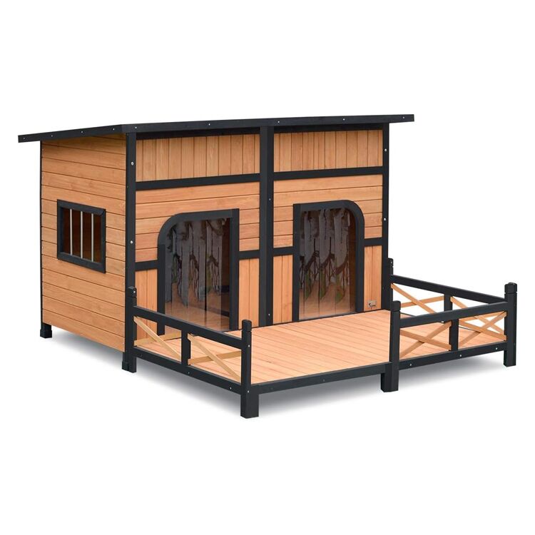This premium dual-room pet shelter provides a spacious and secure outdoor environment for two medium-sized dogs. Crafted from high-quality solid wood, the structure features a unique cabin design that combines two private sleeping quarters with a shared front lounging deck. The elevated floor and slanted asphalt roof ensure pets stay dry and comfortable in various weather conditions. Its modern aesthetic and functional layout make it a top-tier choice for homeowners seeking both style and durability for their outdoor pet furniture.