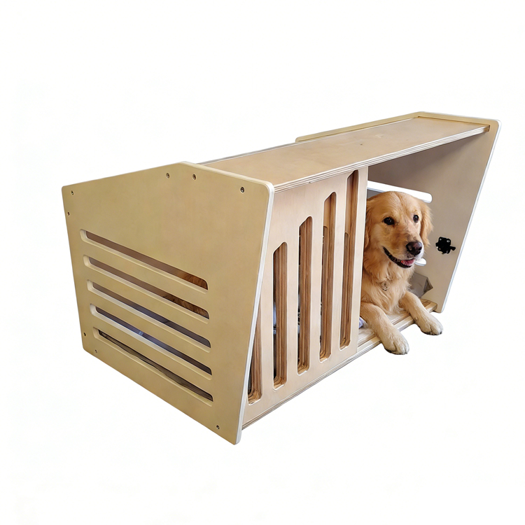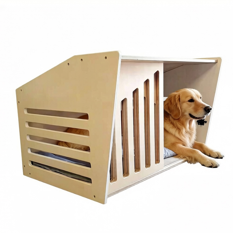 The Modern Indoor Dog House is a stylish, furniture-inspired pet shelter designed for indoor living spaces. Made from durable laminated wood, it combines a clean minimalist look with practical comfort, serving as both a cozy resting place for pets and a functional side table or end table. Its ventilated slatted structure ensures airflow and visibility, while the solid wooden construction provides stability, safety, and long-term use. Shipped as a flat-pack kit, it is easy for end users to assemble and integrates seamlessly into modern home interiors.