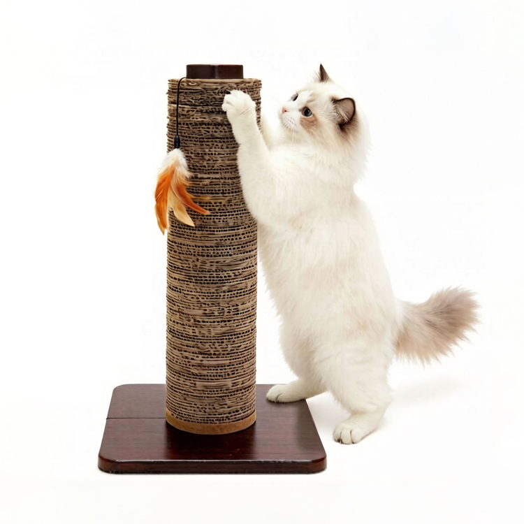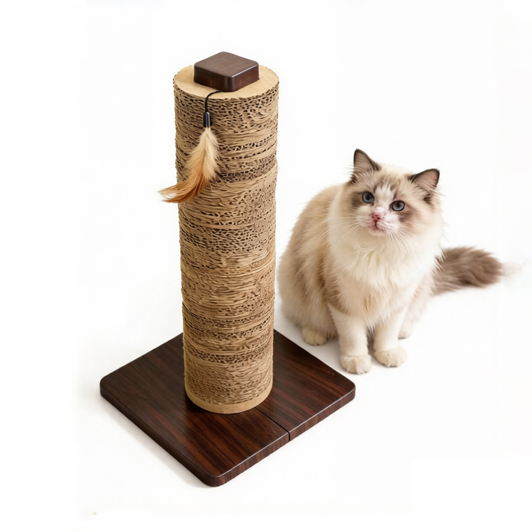 This is a vertical corrugated paper cat scratcher, designed to meet cats’ natural needs for climbing, scratching, and lounging. It’s an ideal product for cat scratcher for pet shop, pet product importers in USA, and B2B cat tree wholesalers, as it combines practicality and eco-friendliness. Made of dense layered cardboard, it protects household furniture by redirecting cats’ scratching behavior, while promoting their claw health and stress relief. As a source factory, we offer spot goods, 24-hour online support, and customized services to fit B2B wholesale demands.
