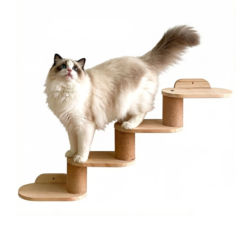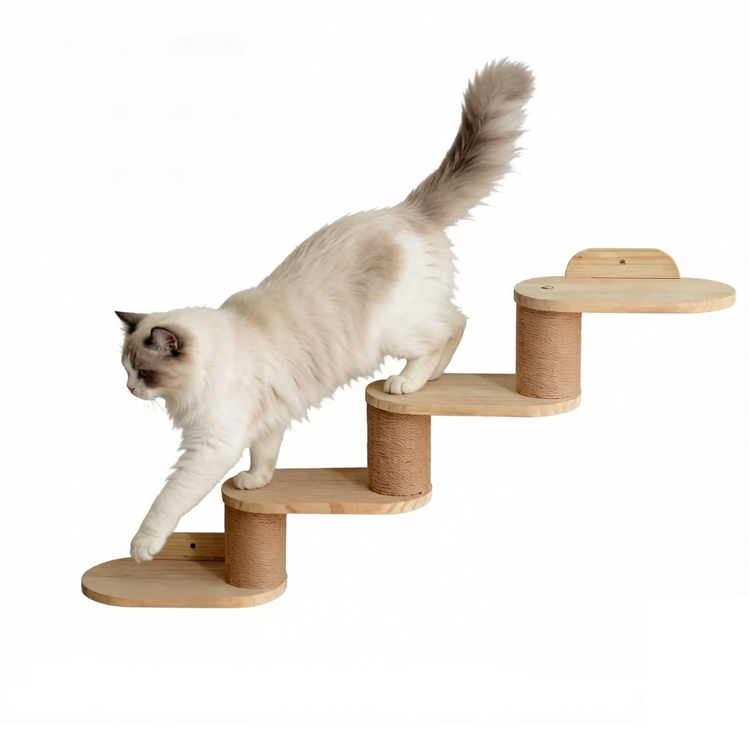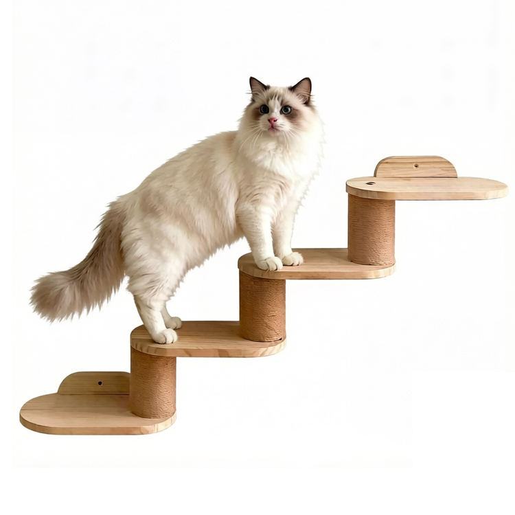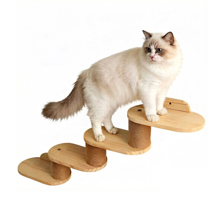 The Wall Cat Step Ladder is a wall-mounted wooden climbing system designed to create vertical activity space for cats while preserving floor area. Made from solid natural wood with sisal-wrapped scratching posts, it combines durability, function, and modern aesthetics. Its modular, multi-level design allows flexible installation to suit different wall layouts, making it ideal for contemporary homes and commercial pet-friendly spaces.