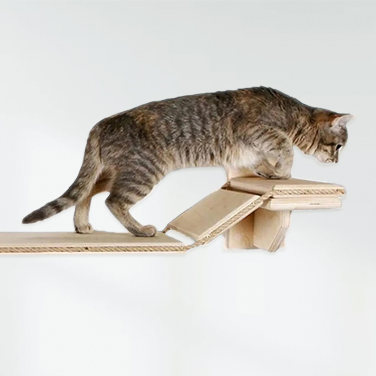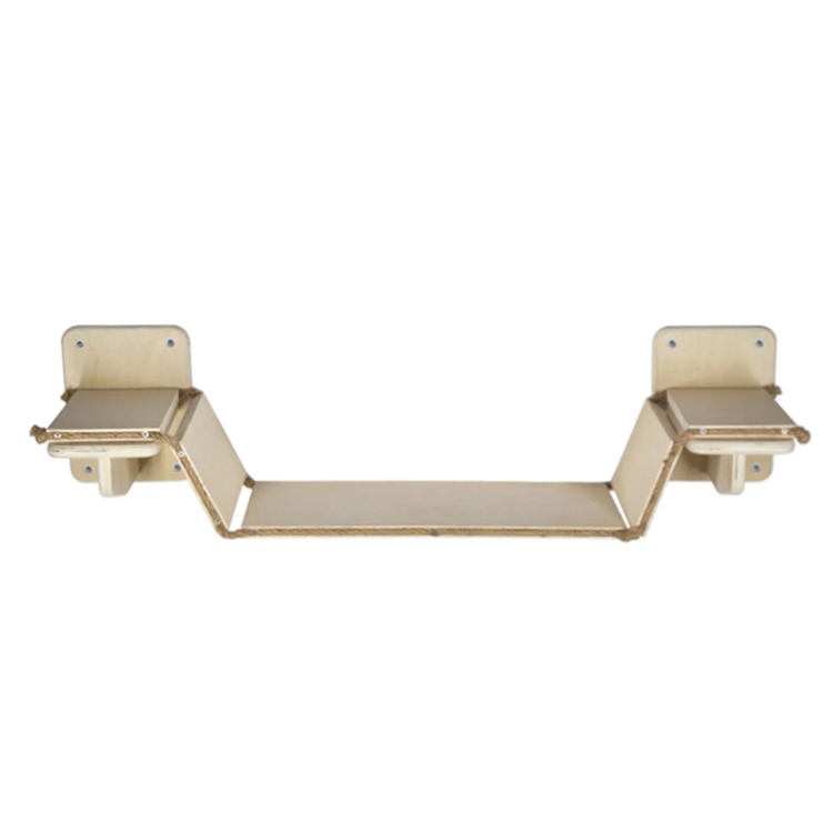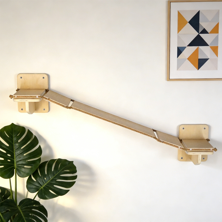The Wall Mounted Cat Bridge is a modern, space-saving cat furniture solution designed to create vertical activity and resting areas for indoor cats. Made from solid wood with a suspended fabric hammock, it combines durability, comfort, and contemporary style. Its modular wall-mounted design allows flexible installation, making it ideal for apartments and modern homes where floor space is limited. This product is well suited for wholesalers, importers, and online pet retailers seeking premium wooden cat furniture.
