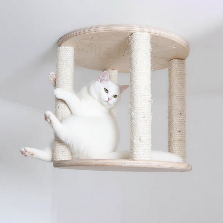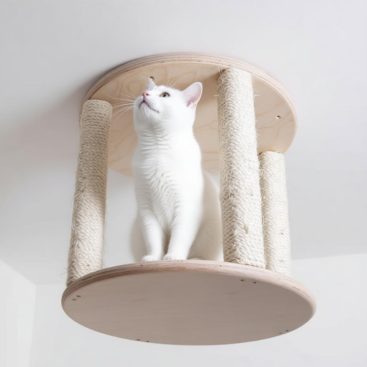 This wall-mounted cat ceiling shelf is a circular perch designed for cats to climb, lounge, and play. Made from durable birch plywood and wrapped in natural rope, it offers a space-saving vertical solution for feline enrichment. Ideal for wholesale and bulk orders, we operate as a professional manufacturer providing sturdy and pet-safe furniture.