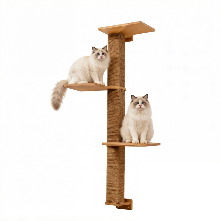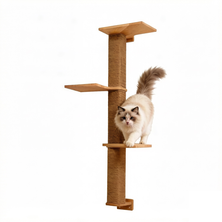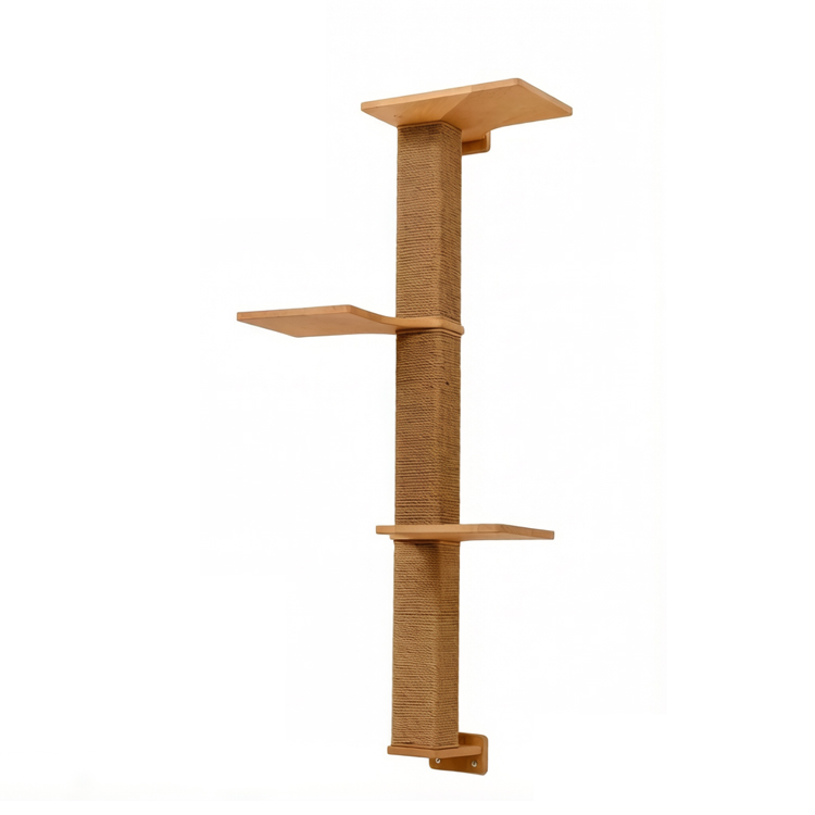 Provide an engaging indoor playground for cats with this wall-mounted climbing frame. Crafted from sustainable wood, this space-saving structure features sisal scratching posts, resting shelves, and interconnected steps. It encourages natural feline behaviors like climbing, scratching, and perching, promoting exercise and mental stimulation. Perfect for multi-cat households, its sturdy, wall-mounted design ensures safety during active play. We are a professional factory offering competitive wholesale prices and support for OEM/ODM projects.