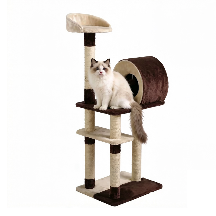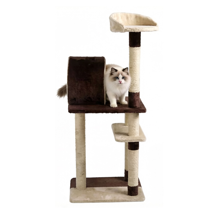This Wood Cat Tree and Scratcher is a multi-level activity center designed to satisfy your cat’s natural instincts to climb, scratch, and play. As a professional manufacturer, we offer this durable structure at an attractive factory price, making it an excellent choice for a bulk order. Standing 123cm tall, it features a compact footprint, robust sisal-wrapped posts, and soft plush platforms for all-day comfort and entertainment.